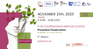 - IT-FR cooperation in Heritage Science: the 9th event dedicated to the theme of Preventive Conservation | November 25 | Online Novembre 18, 2025
